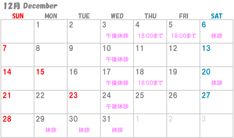 12月28日(日)~2026年1月4日(日)まで休診とさせていただきます。